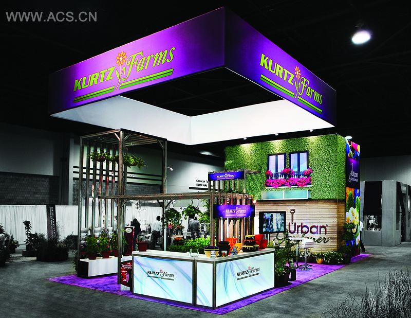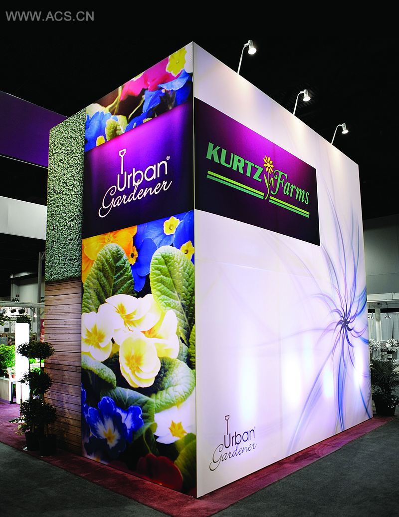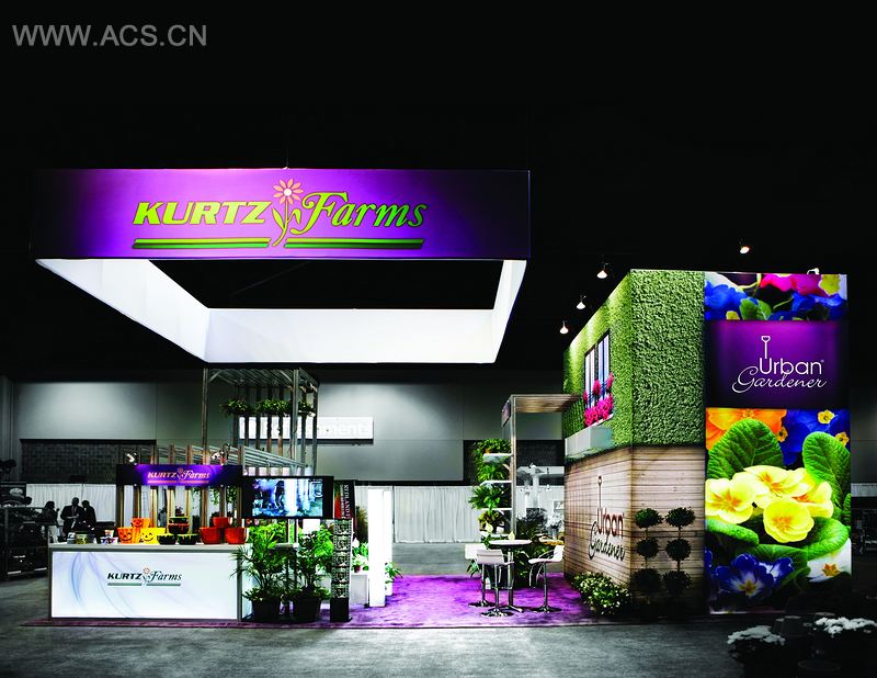 在2009美国亚特兰大园艺展上,库尔茨农场赢得最佳展览。设计师想出了一个都市园艺概念来展现花坛植物和一众创新园艺产品。20’x 35’大小的展区用张力面料和铝型材建造,铝型材料印刻有浅木纹理。高16’宽16’的大型粗布房间通过染料升华处理做成一个会客间,配以一扇粗布门。库尔茨农场在2009美国亚特兰大园艺展的所有展览中脱颖而出。