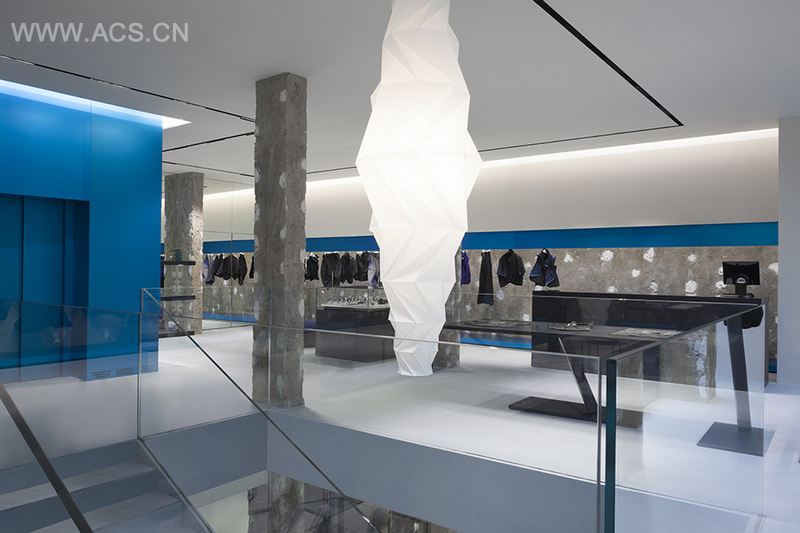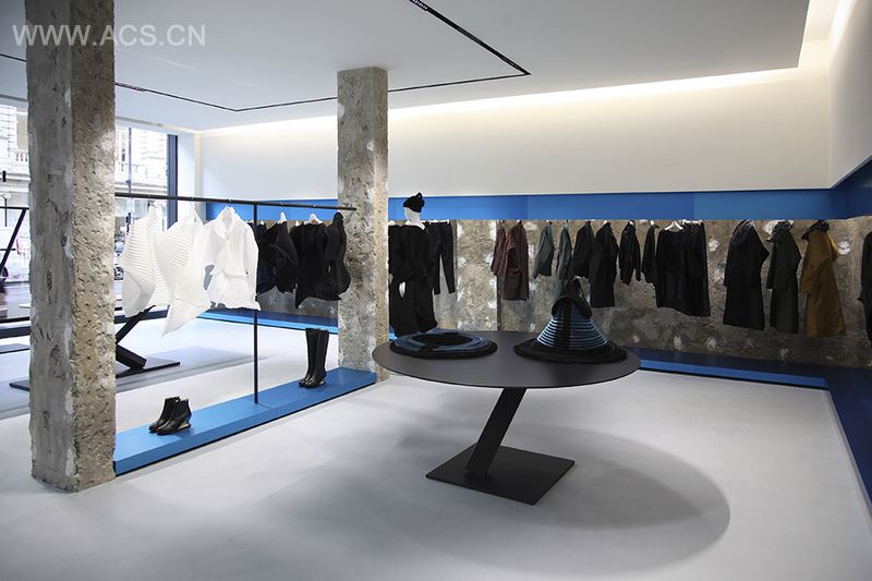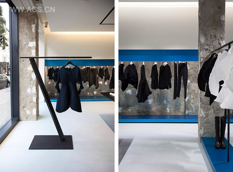 该店面位于布鲁克街10号,现代感的蓝色铝板和裸露混凝土柱之间的形成的反差碰撞。店内展示的是折纸风格的服装,该系列的织物经过三维的蒸汽拉伸,配合铁件的使用,将平面纤维变成折纸的形式。