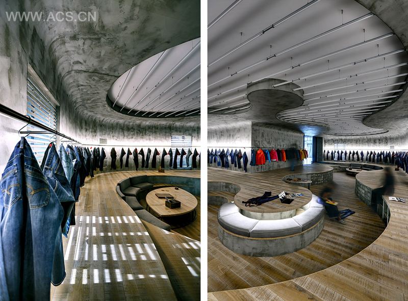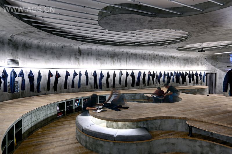 没有常规的家具,利用曲线划分出不同高差的台地,让观察,坐,走,工作,评估产品等行为可以在同个空间里灵活实现,产生多样化的互动。空间色彩中性,除人工照明外还拥有引进自然光的窗户。