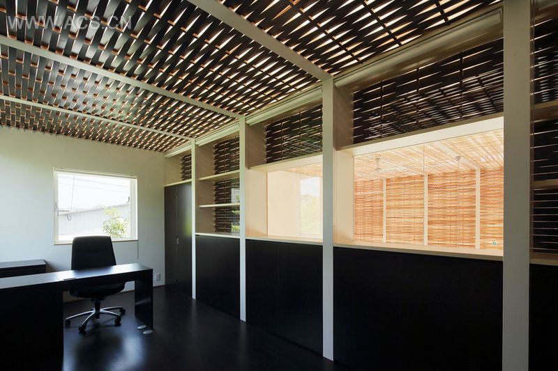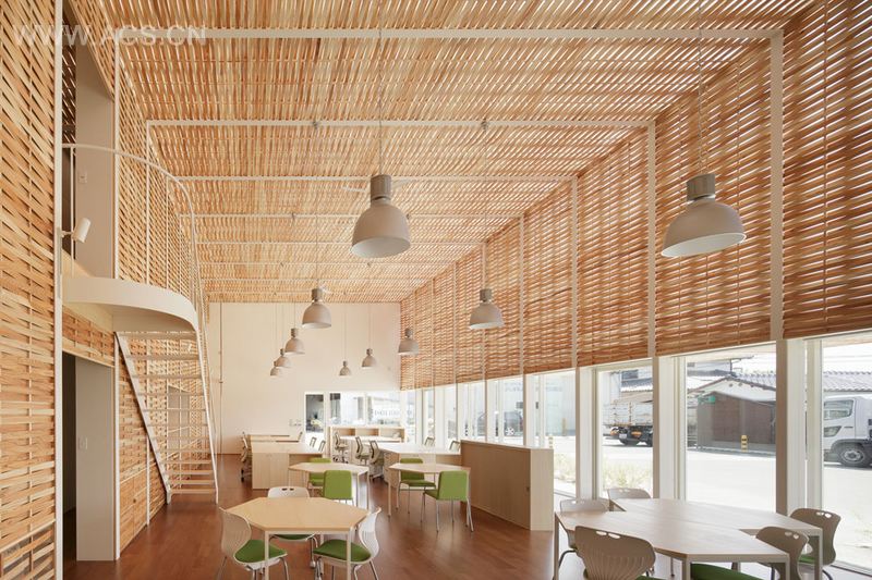 这是位于日本福冈某木材回收公司的办公室。办公室设计使用了可回收材料和自然能源,这十分符合该公司形象定位。办公室建筑的墙壁和天花都是玻璃的,内部覆盖上一层编织,如柳框图样的木条层,这层材料让白天的天光变得柔和,人们不需要开灯就能办公;这层材料也使办公室不至于过热,减少对空调的依赖,所使用木材来自回收的雪松木材。