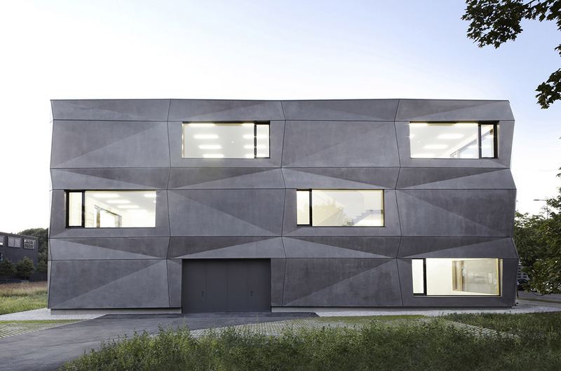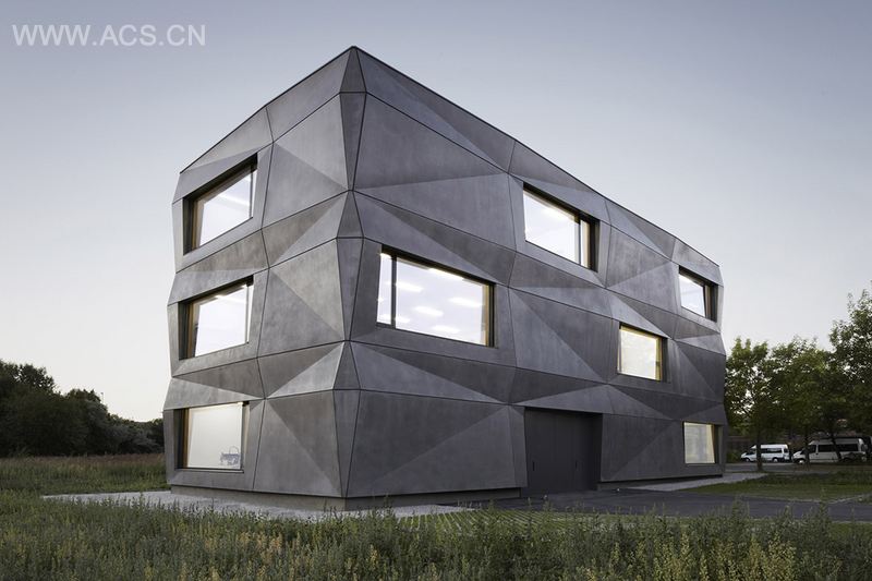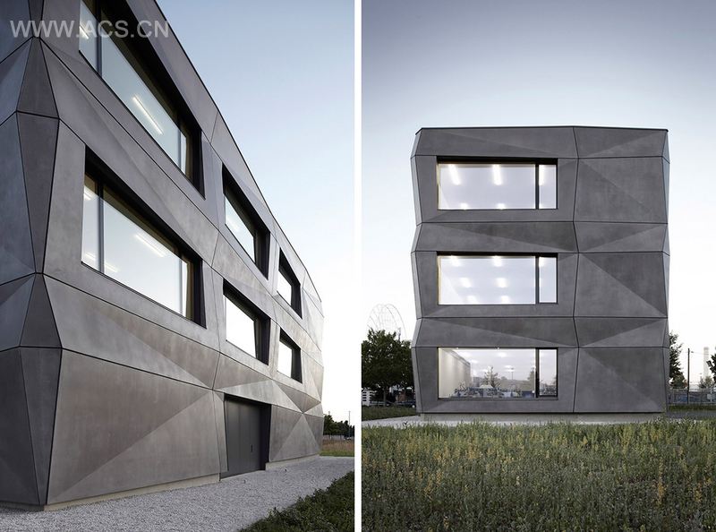 这座新建筑位于慕尼黑,是一家织物制造&贸易公司“Textilmacher”的生产区和办公区。几何折叠的立面颠覆了传统的建筑外观,成为该大楼最具标志性的特点。灰色的哑光混凝土表皮与周围的环境融为一体。立面根据不同时节、不同时段、天气及光线的变化呈现不同的特点。