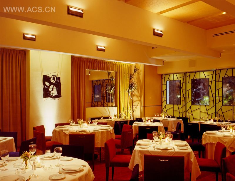 主室由热带木材纳瓦木构成。天花板是拉菲亚树的编织图,产生温馨的氛围并且改善用餐室里的音响效果。灯光有直接的也有间接的,这样一来调光系统可以创造出不同的场景。