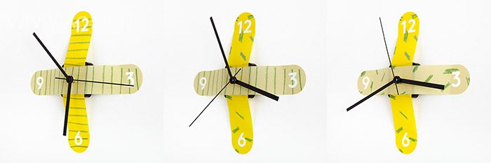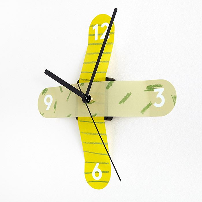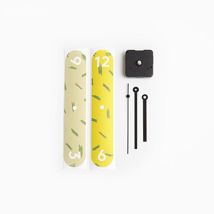贴纸时钟特别版。两个十字交叉的手绘图案条便构成了时钟的表面。由布鲁克林艺术家Elliot Camarra设计了四种组合图案。贴纸时钟组合方便,并不会损伤墙面,可重复粘贴多达200次。