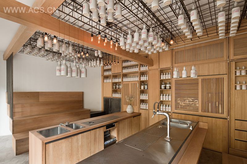 来自Buero Wagner的设计师Fabian A. Wagner与Andreas Kreft负责酒吧内部的设计与装修。其设计风格延续了Bax的酒吧理念—在向巴伐利亚当地文化和木工工艺献礼的同时增加了新鲜元素。这个巴伐利亚风格的酒吧室内面积40m²,两侧靠墙的部位是类似圆形剧场的长椅,这样消除了一般酒吧内调酒师和客人之间的界限。在这里,互动交流变得十分重要,座椅上的每个人都可以清晰地观看Bax及其团队在中心两个吧台区混合、摇动和搅拌鸡尾酒的过程。Gamsei酒吧模糊了所有的传统界限:工作区和饮酒区成为一体。后墙整个墙面上的木质橱柜储存并展示着作为配料的干花、草本植物和叶子;除此之外,咖啡机的栅格门以及洗手间和实验室的门形成了完美和谐的统一体。可以通过灵活关闭或开启栅格门来展示或隐藏门后的物品和空间。看台、吧台和橱柜都由橡木实木制成,表面涂刷天然油。装有自制酒、糖浆和香精的白色陶瓷瓶悬挂在天花板上的黑色钢网上。穿插其中的灯泡在夜间为酒吧带来光亮。