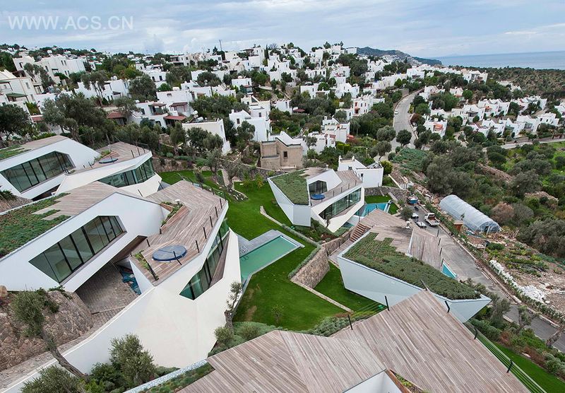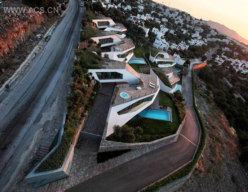 Hebil 157 Houses是位于土耳其西南海岸博德鲁姆半岛上共5间高档别墅的住宅项目。别墅群于风景中凸起,召唤着人们对传奇火山Kos(位于别墅区域附近)岩浆流的古老记忆。设计师在景观设计中首先考虑了保留现有自然景色、地形和树林,并对这些元素进行重新利用;其次便考虑了运用当地植物。10,000株薰衣草和花间翩翩起舞的蝴蝶让整个区域骤然变成了天堂。