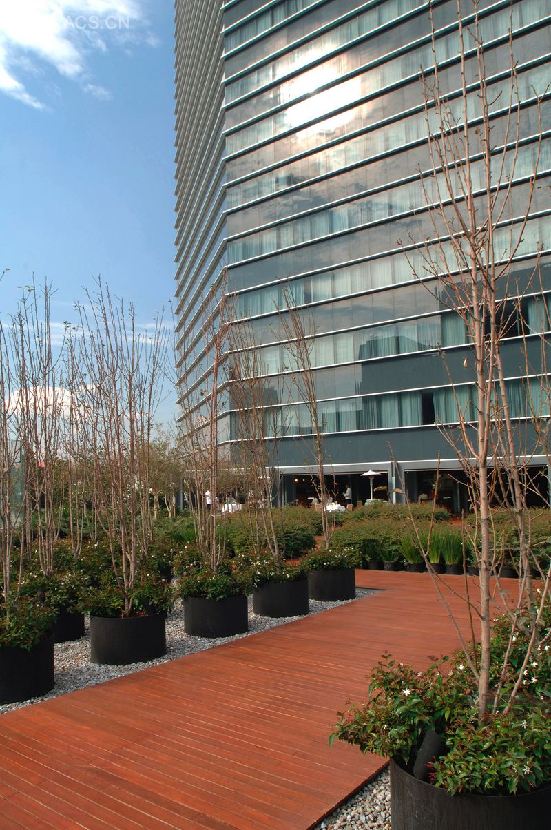 为了延长周末商人在这里的停留时间,这里设计了一个健身中心兼温泉中心,以及一个3000平方英尺的花园。这个花园区与旧的阿拉米达的最初设计在一定意义上相配,但更与当代景观设计相称。它俯瞰着Alameda花园,环绕着“Terraza Alameda”自助餐厅、游泳池和板网球场地。所有区域都铺上了柚木地板,与主街相隔但同时构成了城市环境的一部分。