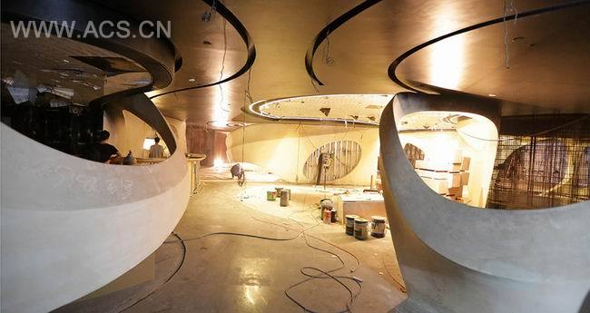 从踏入这里的那一刻,便会被这里的景象吸引,入口处线条圆润的前台就像流水一般,用金属砖片贴成的墙壁寓意为:“山”,山与水的相互渗透就像宋代的山水画一般动人,酒吧的名称Song也是来源于此。用连绵起伏的“山”塑造出大小不一的空间,灯光洒下,树影婆娑。