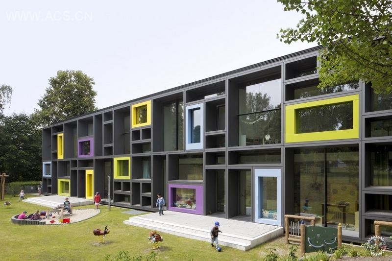 在汉堡市的Eimsbüttel,这座新建的两层建筑与拜尔斯道夫集团园区中心绿化区域相邻。这个极度紧凑的矩形结构围绕其中心的两层多功能房间展开,这个房间用作孩子们的游戏和集散空间。幼儿中心的设计灵感来自拜尔斯道夫的历史,因此幼儿中心就像一个抽象版的药柜子。建筑外立面以框架结构为特色,在满足了各种功能需求的同时,也营造了一个明亮、通透的室内氛围。明亮的大窗户也提供了更好的游戏条件和教育工作条件。