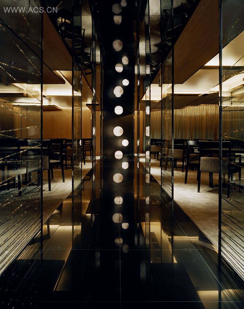 晚上,这个空间变得更加戏剧化,反光地板和动态的室内设施在集中的灯光下创造出一个更加亲密和隐私的空间。入口处的酒窖暗示顾客可以在交谈过程中享用美酒。
