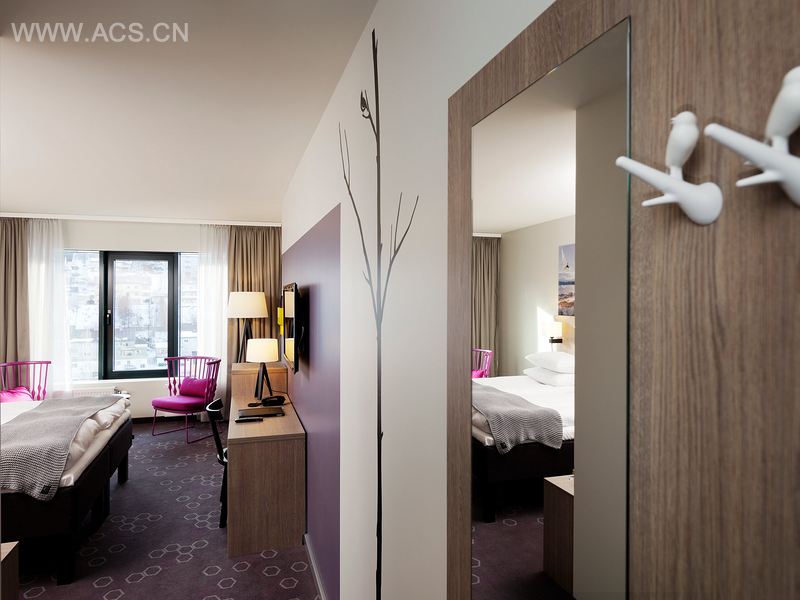 The interior has a modern look that plays on the natural elements found in Narvik. The client wanted a modern and colourful hotel, which also have a nice and warm atmosphere. This was our brief when we started this process. Inspiration is drawn from nature, where you will find neutral colour and bright colour accents and wood. Along with large graphic patterns in vibrant colour combinations in both carpets, wall patterns against the wooden look, we "break" up the tight style of the exterior of the building, to create a calm, warm and colourful atmosphere inside.