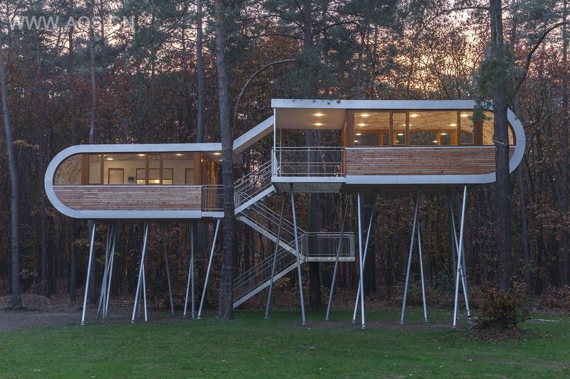 该设计的主要形象是一张打褶且包围内外空间的纸。树屋包括五部分:位于不同层上的两个木屋、相连的阳台、楼梯和相连的屋顶。