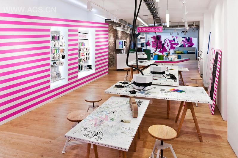 The location in cologne had two challenges: a narrow storefront and a deep floor plan. An architectural element had to be invented which attracts attention at the street and drags the customer into the store: the entranceway with perspective magenta stripes.