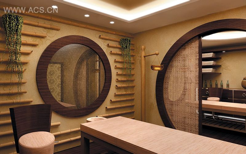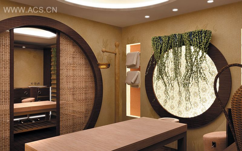The wish of the client, “Izano group”, was to adopt Bali style throughout the Spa. Materials are mostly natural with the predominant earth-like color scheme, like the application of wallpaper. Tonal contrasts were deliberately reduced to a minimum, since the purpose of the massage rooms is to relax the body and calm the mind. The lighting comes from different sources, and gives the user variety of options for adapting atmosphere of the room according to wishes and needs of a client. Lightning is mostly diffuse or ambient type which contributes to a pleasant feeling of warmth and carefree mood.