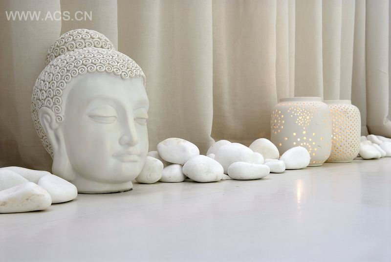 The use of natural materials, the colours of the walls in white and the shades of green and purple, combined with the symbolic applications (Hands of Buddha, the butterfly as a symbol of rebirth and transformation) exude a sense of calm and relaxation.