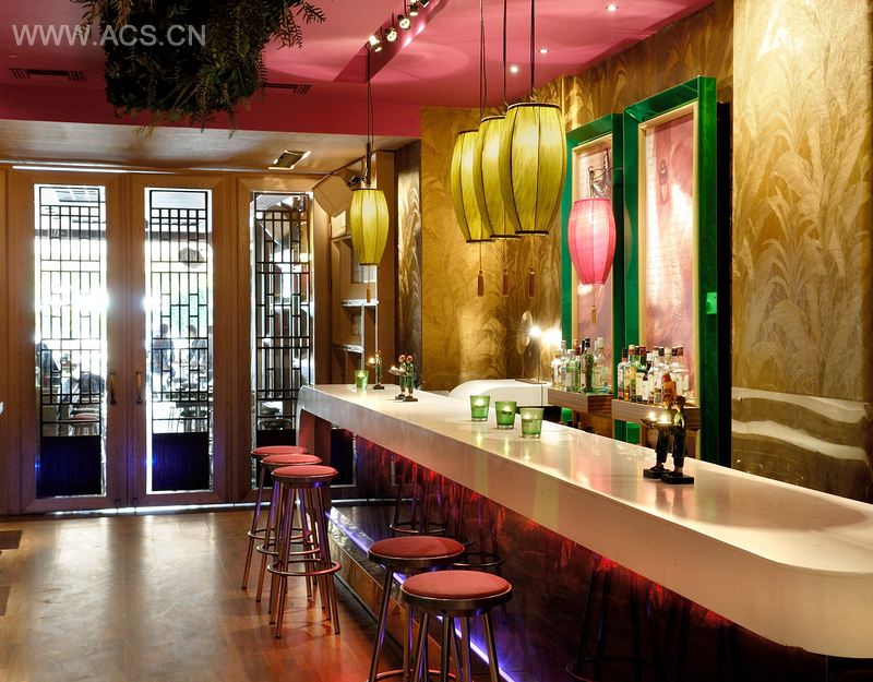 The dominance of green and exotic pink, give a unique tone in the environment while elements such as elaborately s with the face of the Buddha, statues of him, gold plants patterned wallpaper, zen references, collections of butterflies, beetles and precious stones, complete the scene.