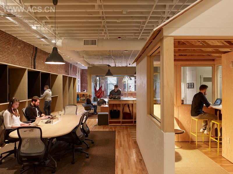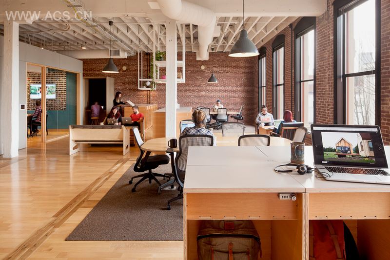 在设计新的办公空间之前,主导设计师 Aaron Taylor Harvey 以及 Rachael Yu 花了一个月的时间在员工间进行调研。他们发现员工们对波特兰这座城市很着很强的归属感,因此,他们更多地选择了来自本地的家具品牌,建立角色认同感。同时,大多数人的工作性质意味着他们并不太需要一个固定的工位。于是,设计团队带来了低矮的沙发、随地而坐的布垫,让员工们可以自由选择办公环境。