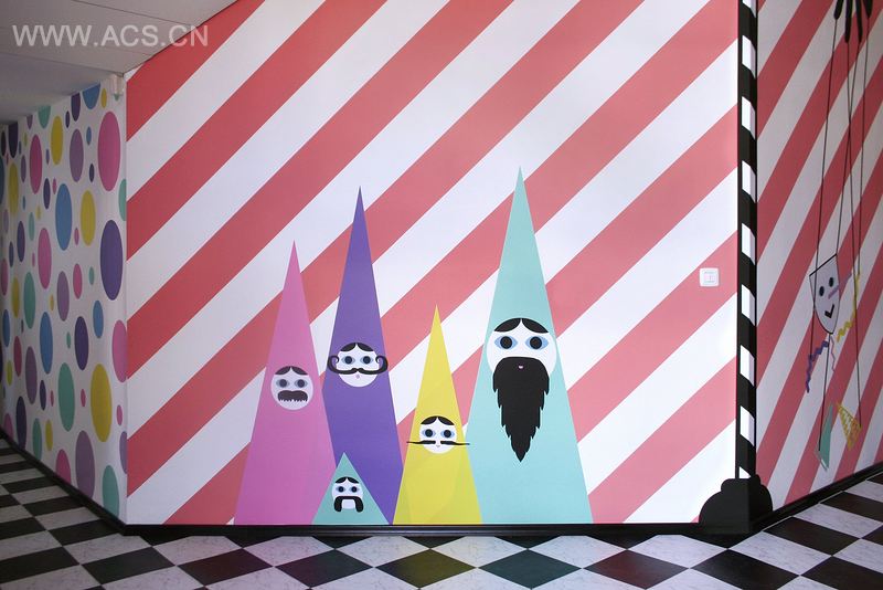 Ljubljana Puppet Theatre is the oldest puppet theatre in Ljubljana, it is located in an classicist building from the turn of the (previous) Century. It caters mainly to children, but also produces many performances for adults. Still the lobby needed an update. We created a fantasy world, a sort of a mixture of Willy Wonka inspired psychedelics and puppet-like characters with a bit of the Wizard of Oz thrown in the mix.