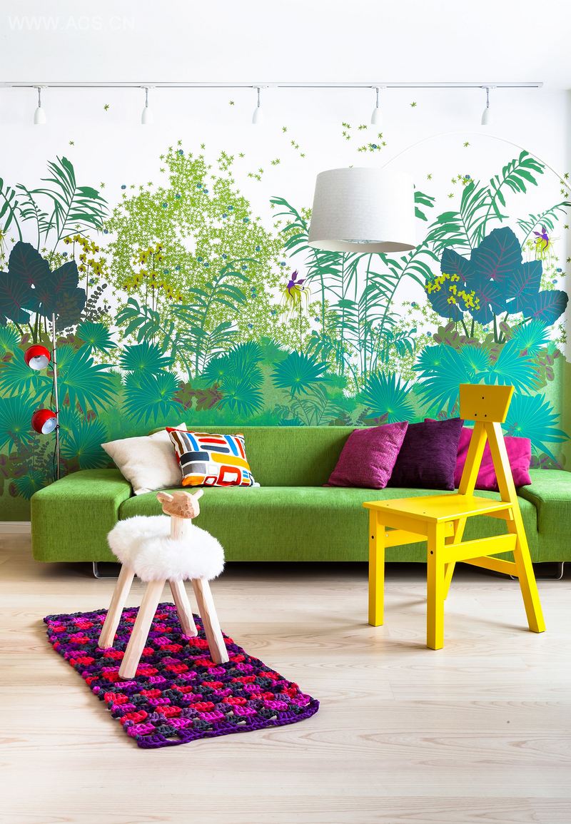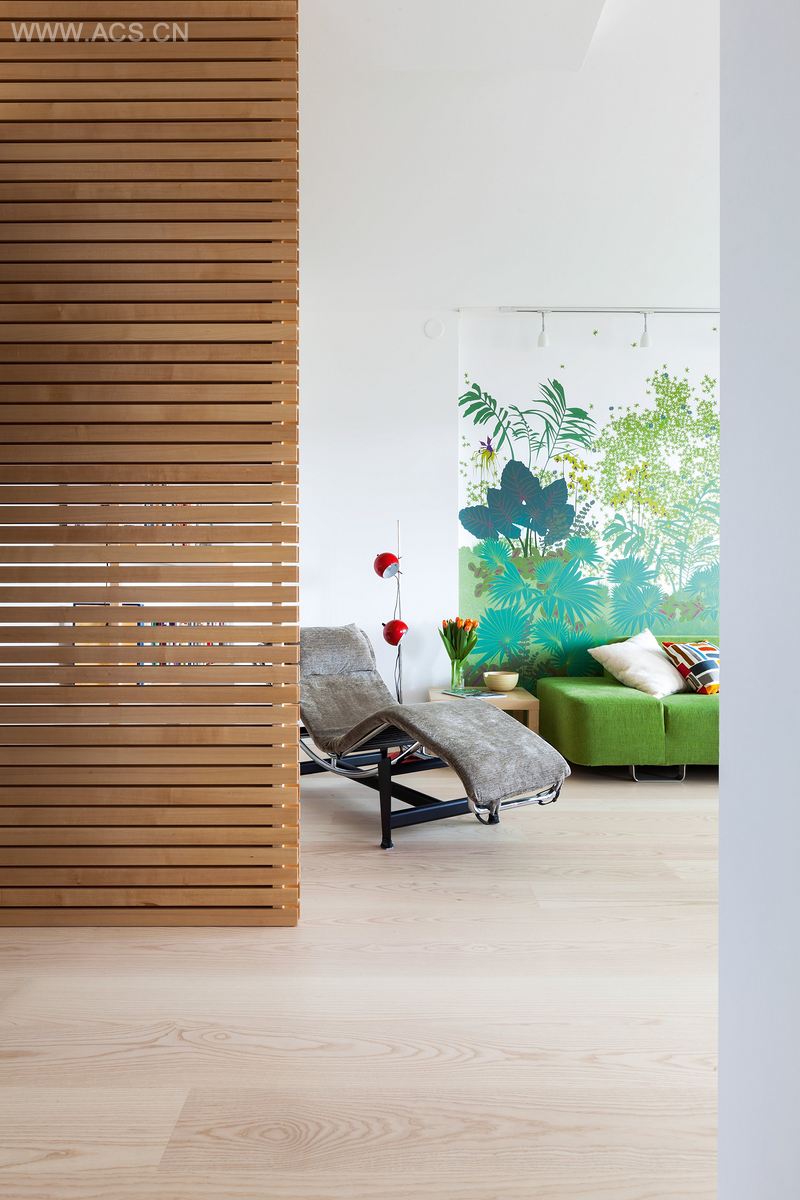 The partial demolition of walls was a natural consequence, along with reversing the location of the bedroom and living room. After fixing this, we decided on the overall “concept” together with my customer, organizing all the details that colored the white spaces. That happened during my customer’s visit to Rome (due to my impossibility to travel in that period), and via 4oo e-mails between Turku and Rome. The result is what I now consider my style: a blend of cultures. There is nothing that stimulates me more than to study different countries and make some cultural themes recognizable but never intrusive in the project. In this case, the floor is covered with parquet of white ash, the shelves are birch and the kitchen table is also birch but colored with heat. Wood is an omnipresent element in this flat as it constantly is for Finnish people, but the real attention is catalyzed by the nature theme pictured on wall paper, carrying colours and contrasts and a typical Mediterranean “courage”.