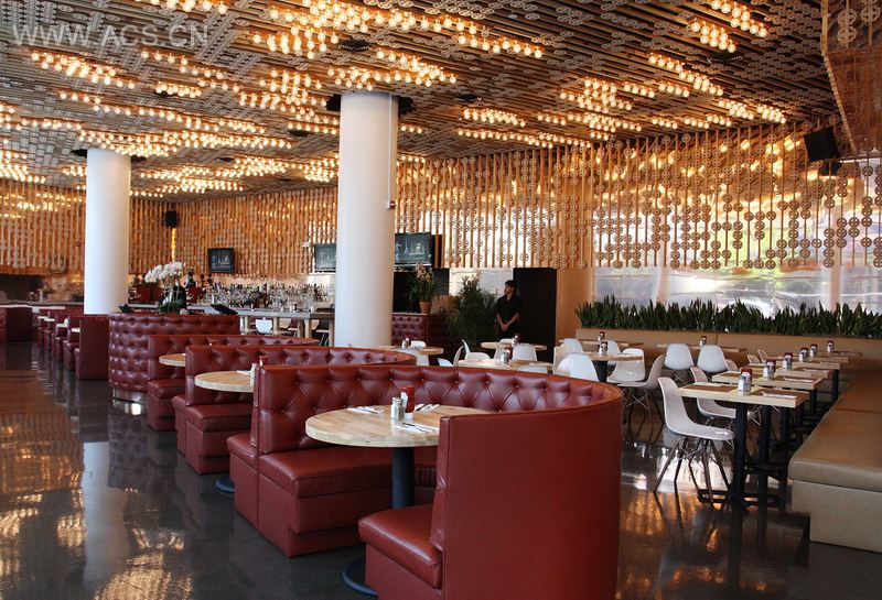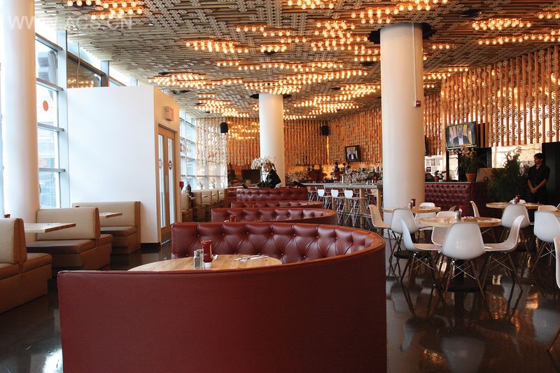 这个空间设计旨在全天营造一种温馨活泼的氛围,提供早中晚餐。天然的圆雕饰板在铜面墙壁上互相协调,窗户边快餐风格的长凳与柔软而奢华的红色座位隔间相邻。无装饰的灯泡随着一天光线的变化而展现不同的氤氲。