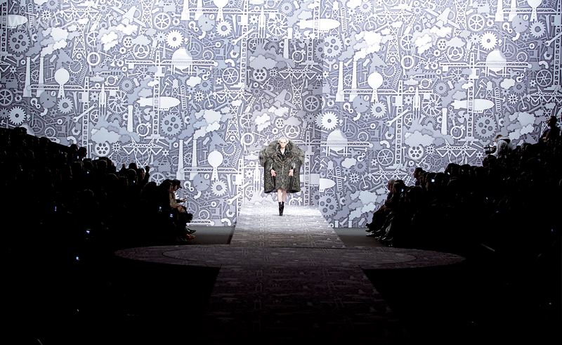 The of the scenery is a pattern we originally composed for a series of marquetry s, d “industry”. Especially for the occasion Nynke transformed the pattern into a more theatrical, 3D form that reminded us slightly of Fritz Lang’s metropolis. Together with Viktor & Rolf we decided to totally wrap the giant catwalk and backdrops with more than 1000 m2 “industry”! It was pleasant to see how naturally this architectural scene was absorbed by the glamour of the fashion industry.