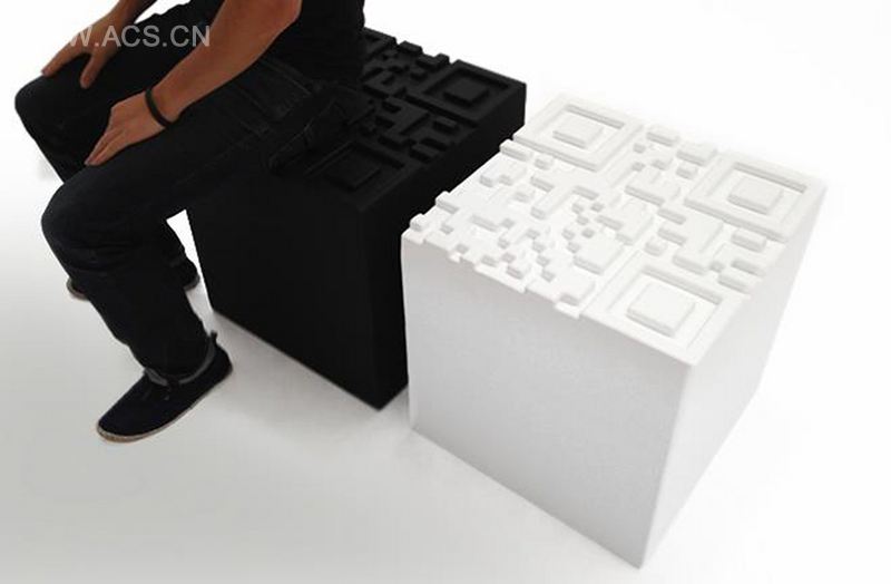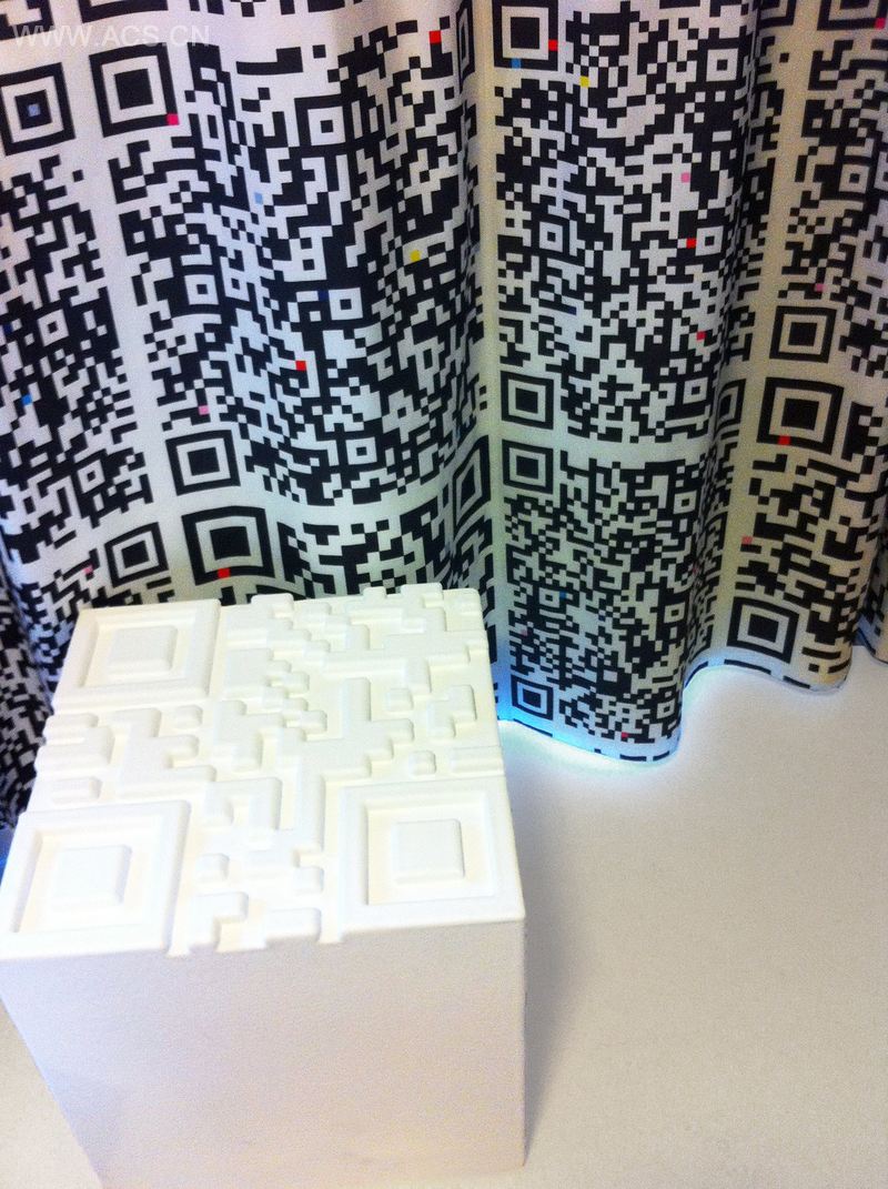 Peters translated the concept into every detail. The lamps are square, the wallpaper and curtains contain QR-codes. The pillows and plaid are gigantic blown-up QR-codes, made in collaboration with Daphne de Jong. And together with Quinze & Milan he developed square poufs with a Qr-code lasered out of the top-relief.