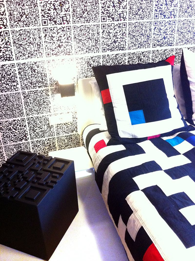 One of the rooms of the Fashion Hotel MODEZ in Arnhem - curated by Piet Paris - is designed by fashion designer Antoine Peters. The craft of patchwork and quilt inspired Peters to a contemporary translation of the QR-code. This is a checkered code which can be scanned with your smartphone and directs you to an image, text or movie. The entire space, walls, textile and furniture consist out of QR-codes. In the seemingly abstract room the guest is virtually surrounded by a much lesser abstract world. Scanning the codes guides you into the world of pornography, pin-ups and other piquancies.