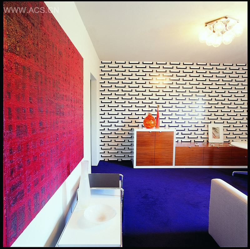 A “white box” design solution was exactly what the client wanted to avoid. She wanted her apartment to be dramatic, moody and have a sense of theatre, which would in turn reflect her love of textile and fashion. The scheme was inspired from the original and poignant style of 1970’s interiors. The apartment is housed in a 1970’s redbrick flat. This leads to Florence Broadhurst and Signature Prints. The vintage pattern wallpaper was customized using a colour scheme of navy blue, beige and white. The scheme evolved into a rich ing of the different interior mediums on which this pattern was printed, which are wallpaper, cotton for the bed linen, fiberglass fabric for the blinds, and artwork.