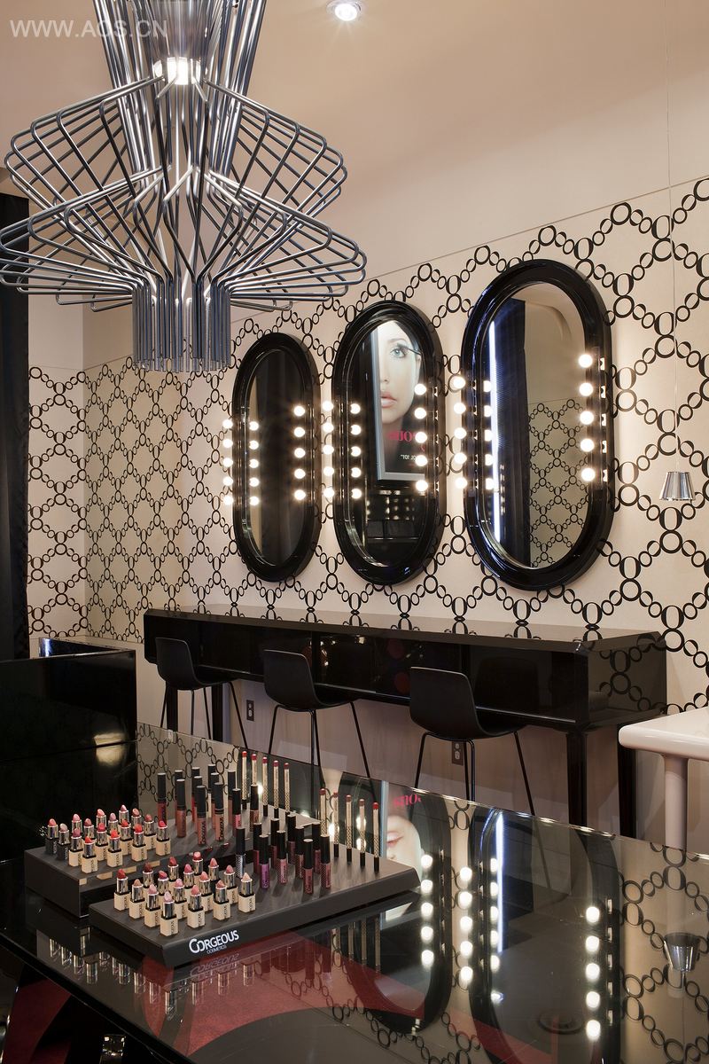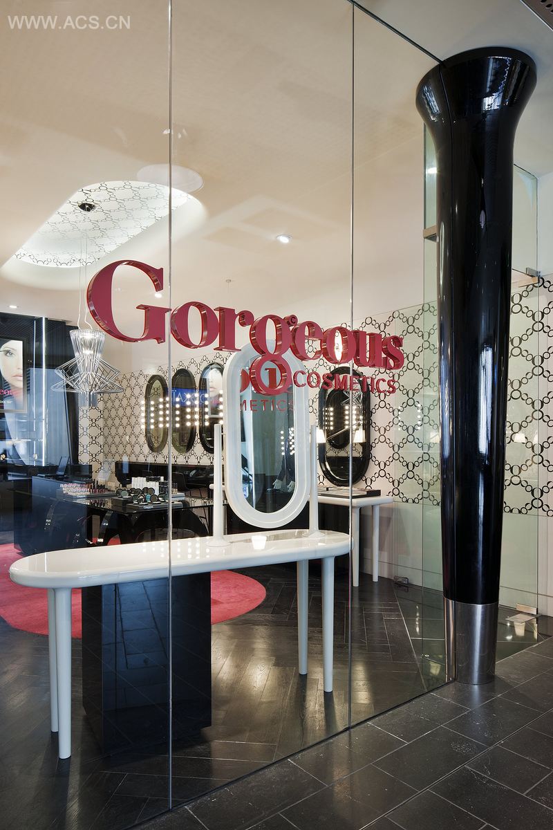From the outside the customer might feel like they have drunk from the bottle labeled “Drink Me” as they walked beneath the oversized table leg, pass the double sided looking glass, into the futuristic, seamless, organic lines fused to form Australian cosmetics brand, Gorgeous Cosmetics’ latest retail offering in Melbourne. From floor to ceiling the design of the store blends fluently with no sharp edges fashioning a gentle feminine quality in muted flesh tones. Even the furniture is fluid and continuous as if it was poured out in situ, though to avoid the expected “built-in” style, the space is deliberately arranged in a seemingly higglety pigglety manner. The brands logo, seen in repeat pattern, adorns the walls and ceiling coffer and is echoed in the central island unit under a thick pane of smoked glass. The colour palette, though predominantly neutral, is offset by an application of strong rouge red carpet, inset into the black stained oak herringbone flooring.