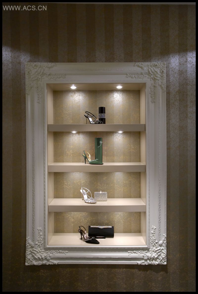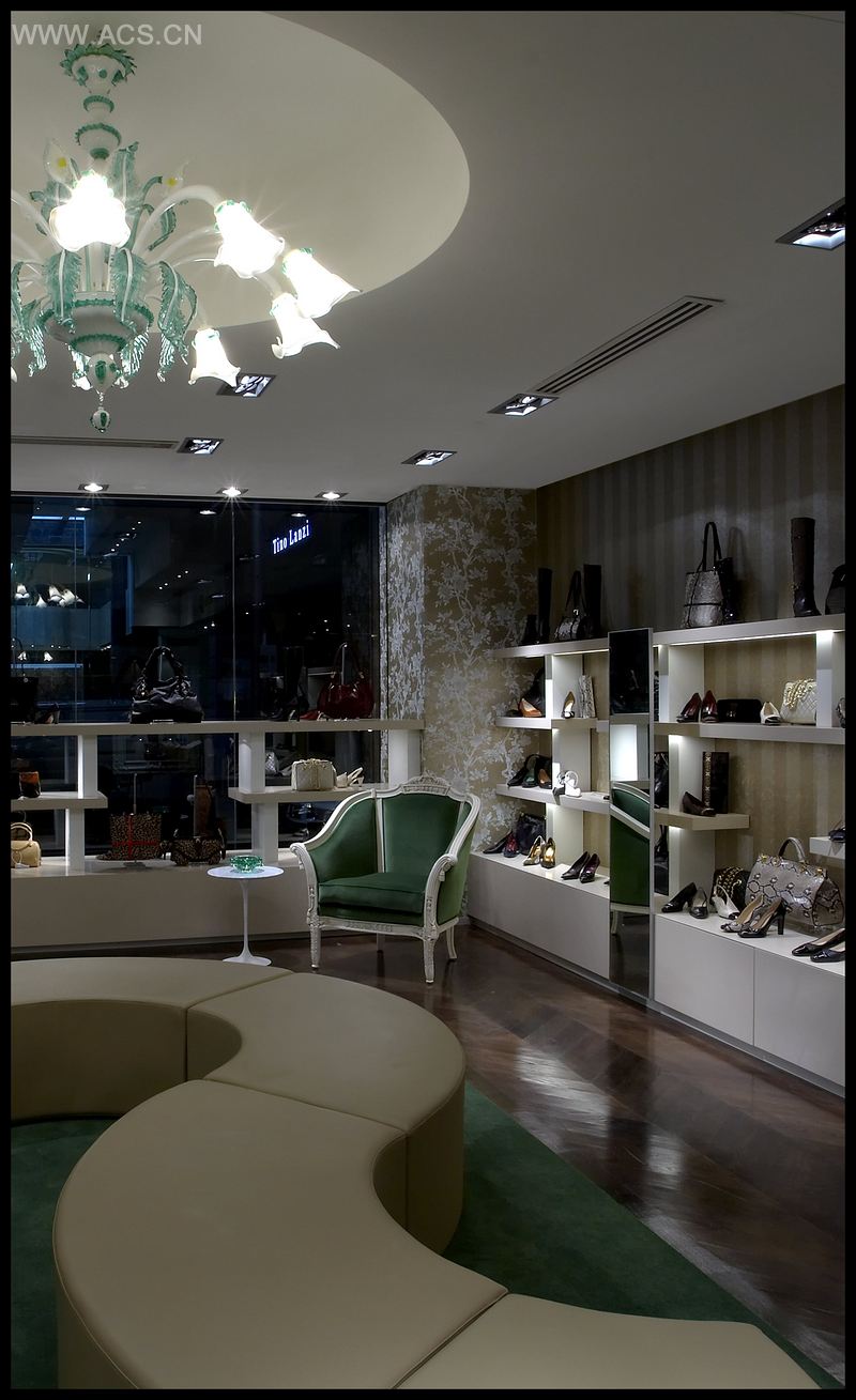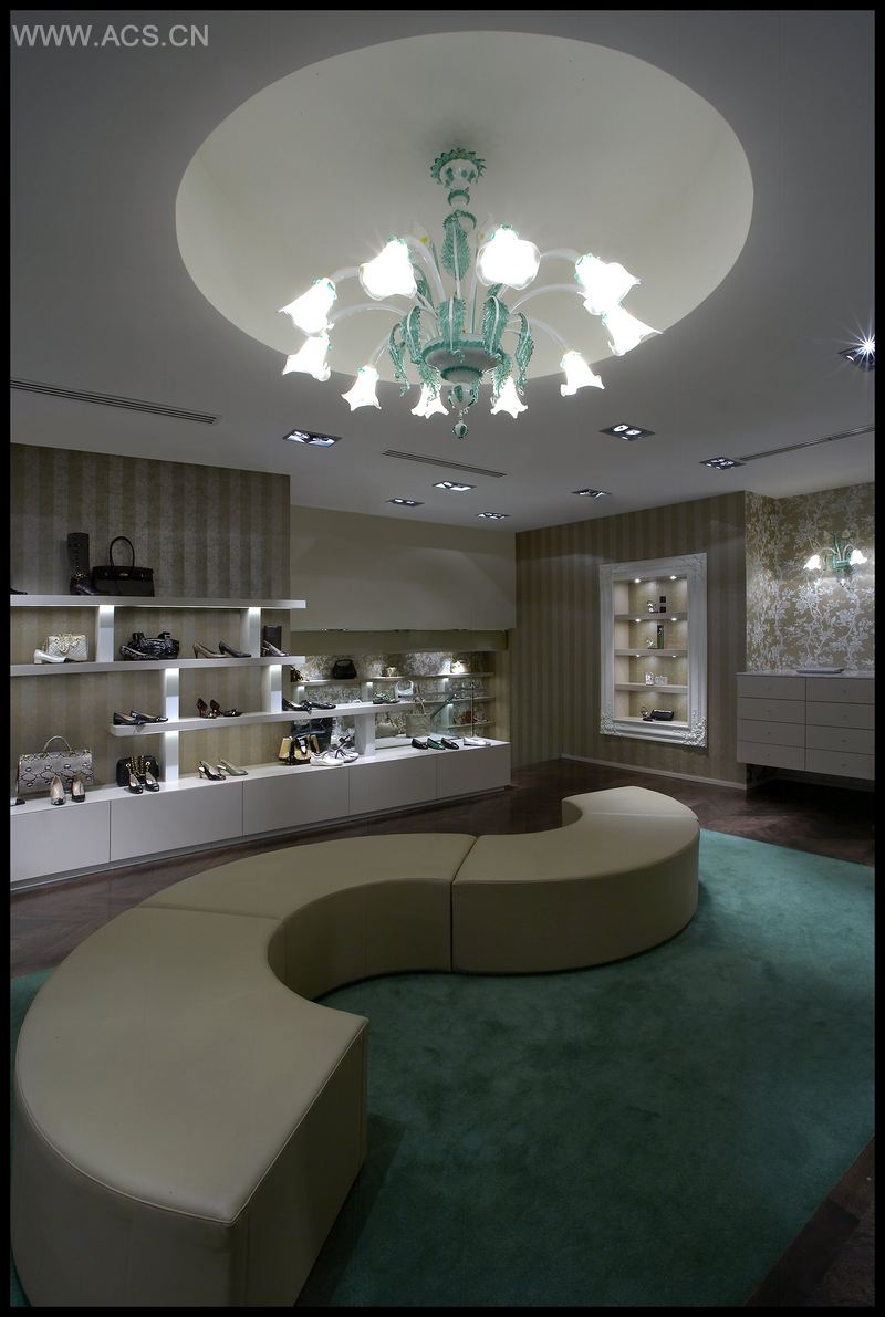 The soft, feminine ladies shoes store was designed to be like a modern summer garden gazebo. The walls are lined in a champagne paint finish and bronze floral wallpaper with little summer wrens and delicate ribbon stripes. The joinery is set in stark contrast using white polyurethane with sharp lines creating a lattice like effect. The green carpet creates a grassy floor finish, the oak chevron floor is earthy and organic decorative motifs give formality. A huge Lily chandelier and sconces literally grow from the surfaces.