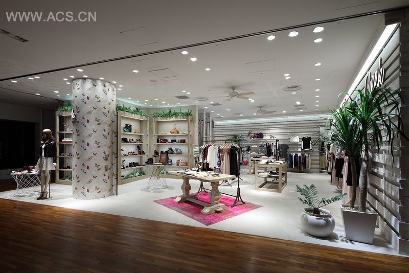 For the shop design, we tried to give brand's West Coast taste with wooden louver in white weathered-like finish, coral limestone and two ceiling fans. These bring in feeling of seaside as well as dry West Coast Summer atmosphere with strong lighting effects to the shop interior.