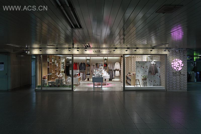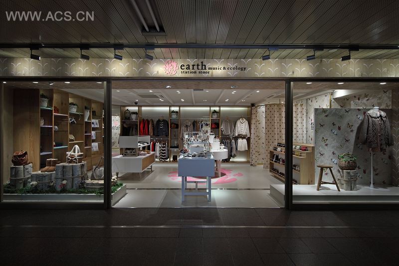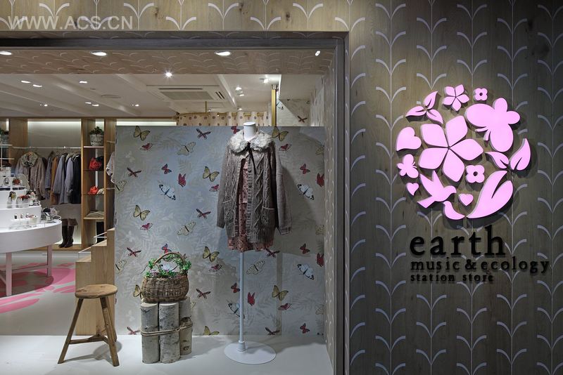 A Kiosk-type life style shop, "earth music & ecology " , which deals with interior items, sits just next to one of the busiest station in Osaka. The brand is familiar to many through its TV commercial, which features actress Aoi Miyazaki and renders a natural and girly image to the brand. The interior design concept is 'a small hut in a forest', where girls visit in a daily journey. Tones of white and oak in the interior render nostalgic atmosphere, and also a fragrant scent in people's memories.