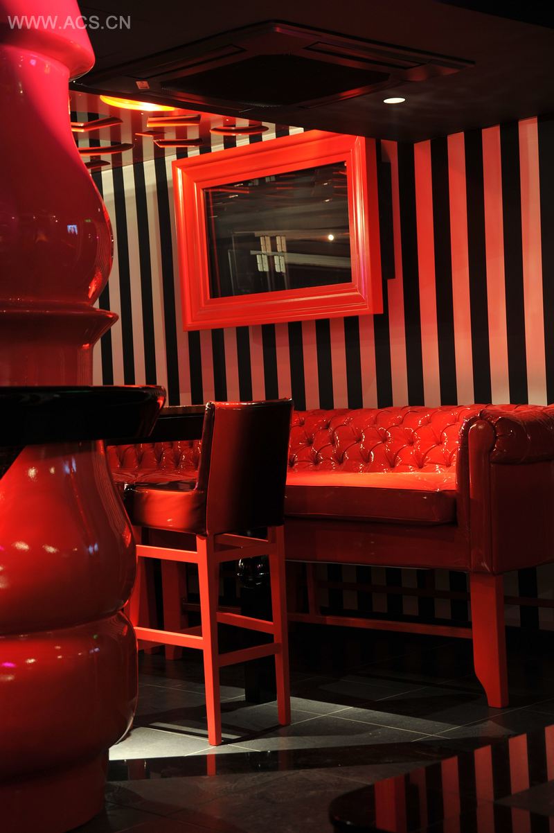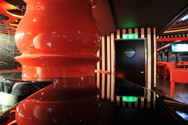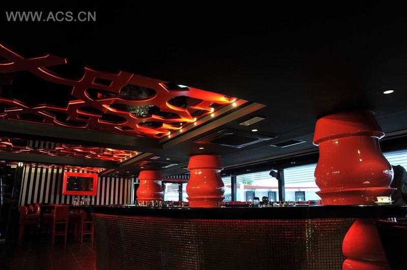 This is an astonishing lounge club and cafe, located in Limassol, Cyprus just few meters away from the sea. It contains a cafe section overlooking the Mediterranean Sea, dance floor, multiple VIP areas and two bars, each with their own unique design. On the entrance where the staircase is, l tubes where placed diagonal as railing and on the other side the wall is decorated with silver leather. There is a continuity of the shapes to the wall facing the stairs as well, which is decorated with mirror. This combination of materials, shapes along with the purple carpet give a bit of “taste” of what the visitors will see inside. A different level was created for the VIP areas with two custom made red sofas and tables where the back wall is decorated with the wallpapers.