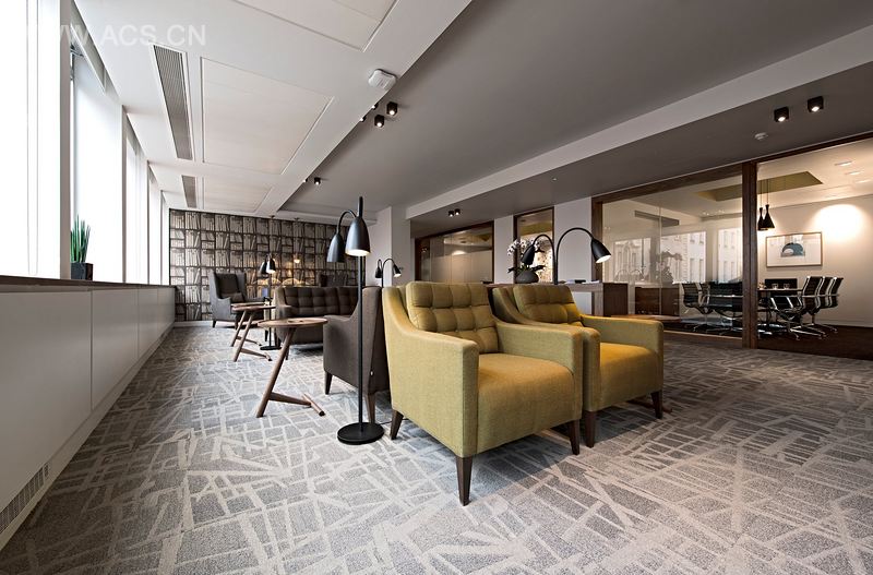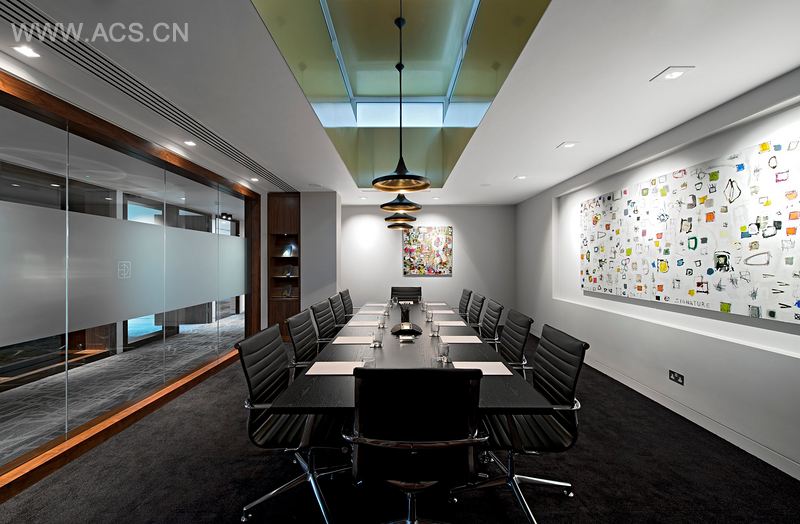 The second meeting room opposite the Board Room on the outer wall is a glass and walnut- d room with a walnut meeting table and creamy Tektura wallpaper, which looks like stitched leather and adds some tactility to the space. The third meeting room is a similar treatment with Tom Dixon pendants again in a different shape, and the same Nantias leather chairs as the board room, although it’s a much more intimate, small space. Natural light again pours into the room from a skylight above.
