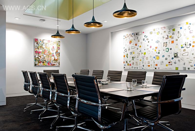 The largest of these is the Board Room, on the left, featuring a large black ash meeting table, complete with cable management for audio-visual purposes and black and chrome leather chairs.