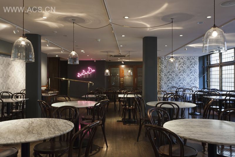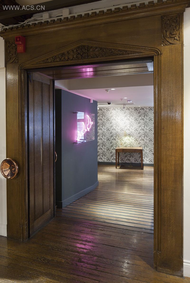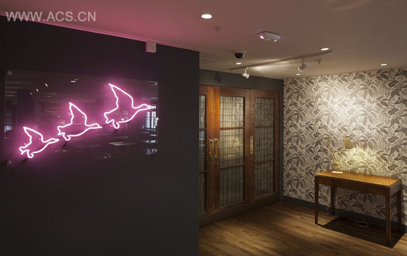 Major new features include reclaimed 1920s doors (sourced from Retrouvius); a 1920s Arts & Crafts washstand, reading desk and mahogany cabinet to serve as greeter and waiter stations; eye-catching hand-blocked wallpaper (by Martha Armitage); a series of beautiful reclaimed glass lights and three neon flying ducks (bespoke-designed by SHH’s lead designer on the project, Helen Hughes) at the entrance of the café, to attract attention and give the room a contemporary tweak.