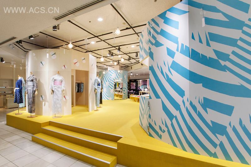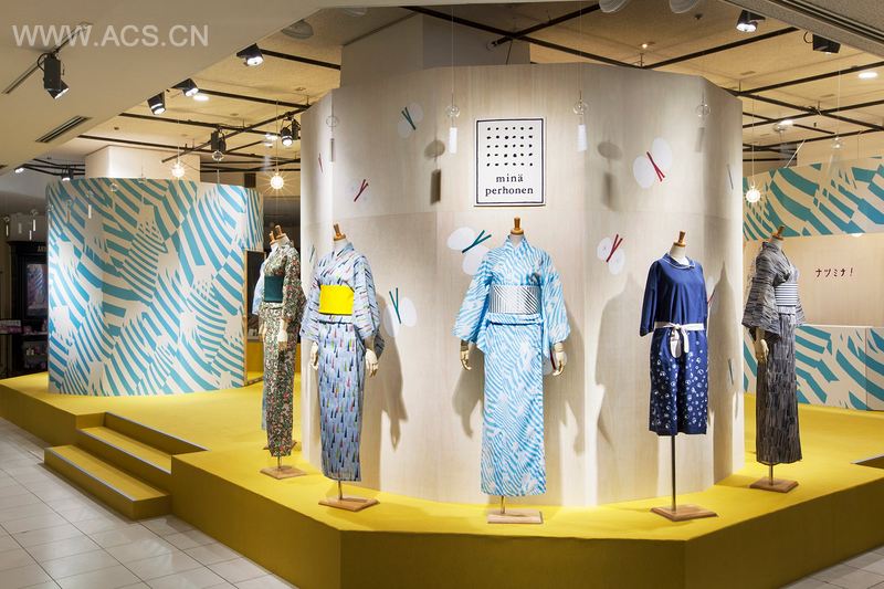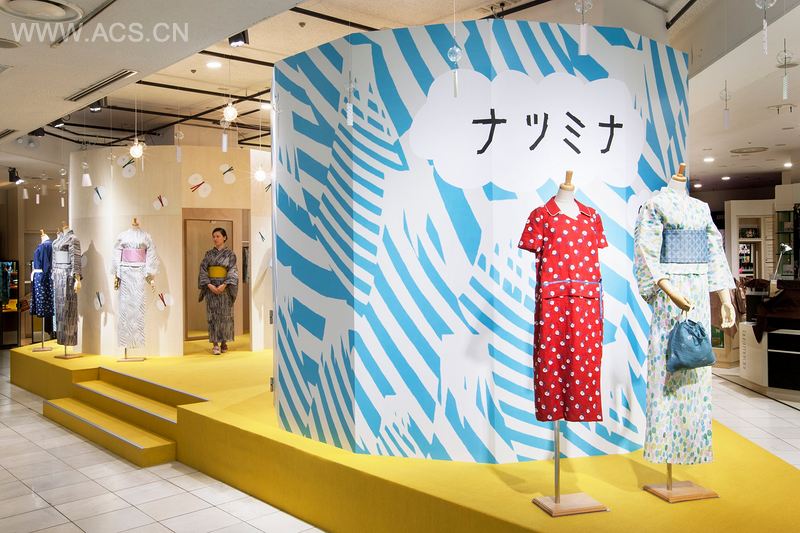 This fifth installment is themed “natsumina” (the meaning of natsu is ‘summer’ in Japanese), and since the main feature is the yukata (a summer kimono) in 10 different fabric patterns, we arranged the dressed mannequins around the central booth. We also hung light bulbs and wind chimes to project the image of a lively summer festival.