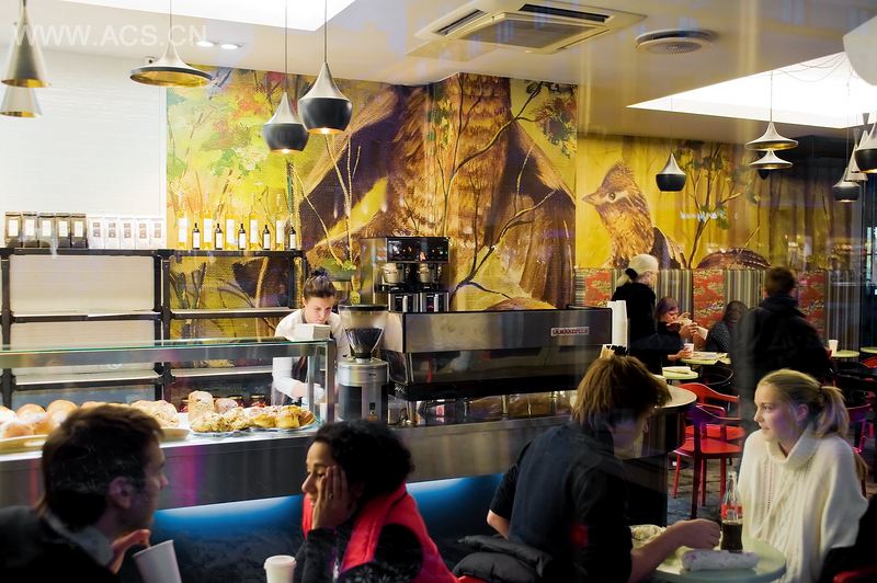 In the kitchen we are using classic French bistro tiles, while the walls in the customer area is covered with photo wallpapers with a painting of a hunting picture.The original of the picture “Ruffnecked Grouse” ( Oil on canvas, size: 24x36 inches, 1971 ) by Peter Darro was bought by the BIT owner at RoGalleery NYC/ 2009. This painting is used for the packaging design as well.