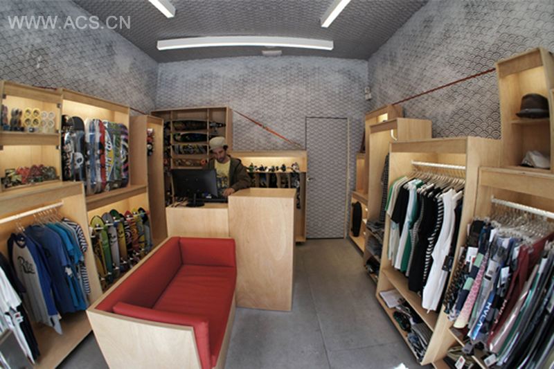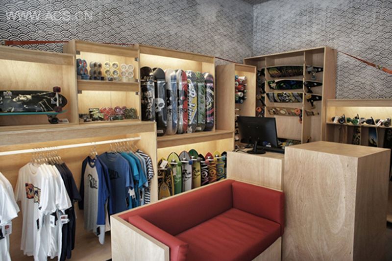 In this case we have reinvented the traditional skateboard store. We wanted it to have a very strong personality, different from the rest. In order to obtain the desired effect, but without losing the identity and the original essence of skate, the store concept was d on two pillars: on the one hand, we wanted to keep the plywood board, which, together with the concrete, is the icon and natural texture of any skate park; and on the other hand, we wanted that the space radiated the urban appearance of the skate’s place of origin. We have used urban art but in its more avant-garde version, showing in this way the cultural influence that the skate has had during the past 30 years.