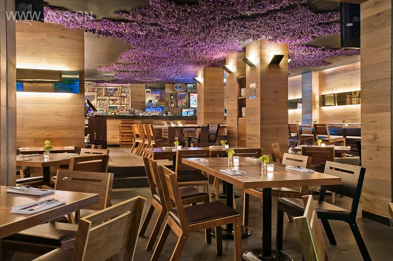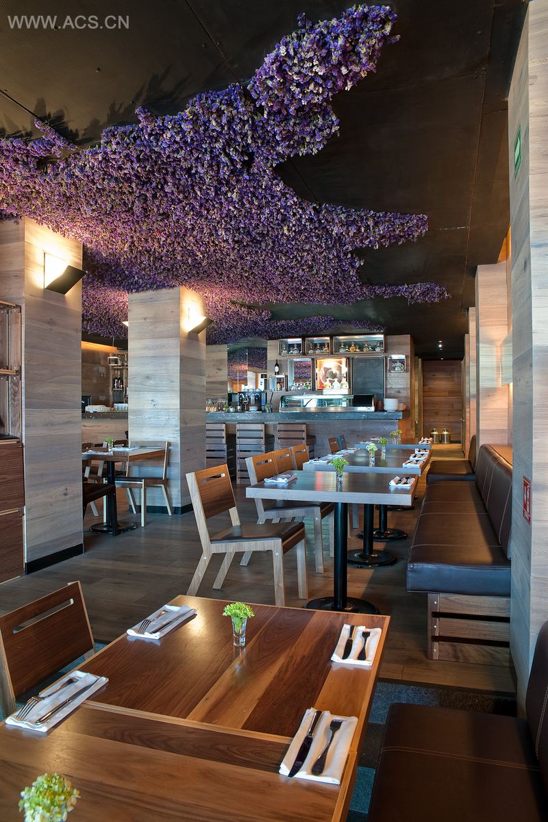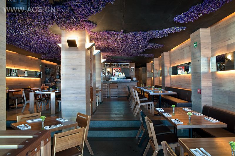 这家墨西哥餐厅坐落于墨西哥的La Condesa,提供给客户一个现有的空间,满足各种功能需求并表现出客户的特征和个性。此项目是与墨西哥艺术家Jeronimo Hagerman合作完成,他设计了天花板,并美其名为“Ando volando bajo” (我在低飞)。天花板被黑色多孔防护板覆盖。紫粉相间的碎花悬挂于天花板,形成不同的图案,使人联想到墨西哥云彩和花朵的景观。当一个人走进餐厅的时候,食物及鲜花的香味沁人肺腑。地板是由黑石制成,设有通向餐厅内部的木板平台。中间的柱子由木板覆盖,在间接灯光的照耀下呈现出别致的光彩。桌椅是餐厅设计的特色所在,强调了客户关心的问题:陈设不仅仅是装饰物,它可以定义所在的空间。此项目旨在重新解读一个墨西哥图标“el charro”,创造一个现代而优雅的餐厅,使之具备独一无二的特征来展现与墨西哥这个美丽国家的关系。