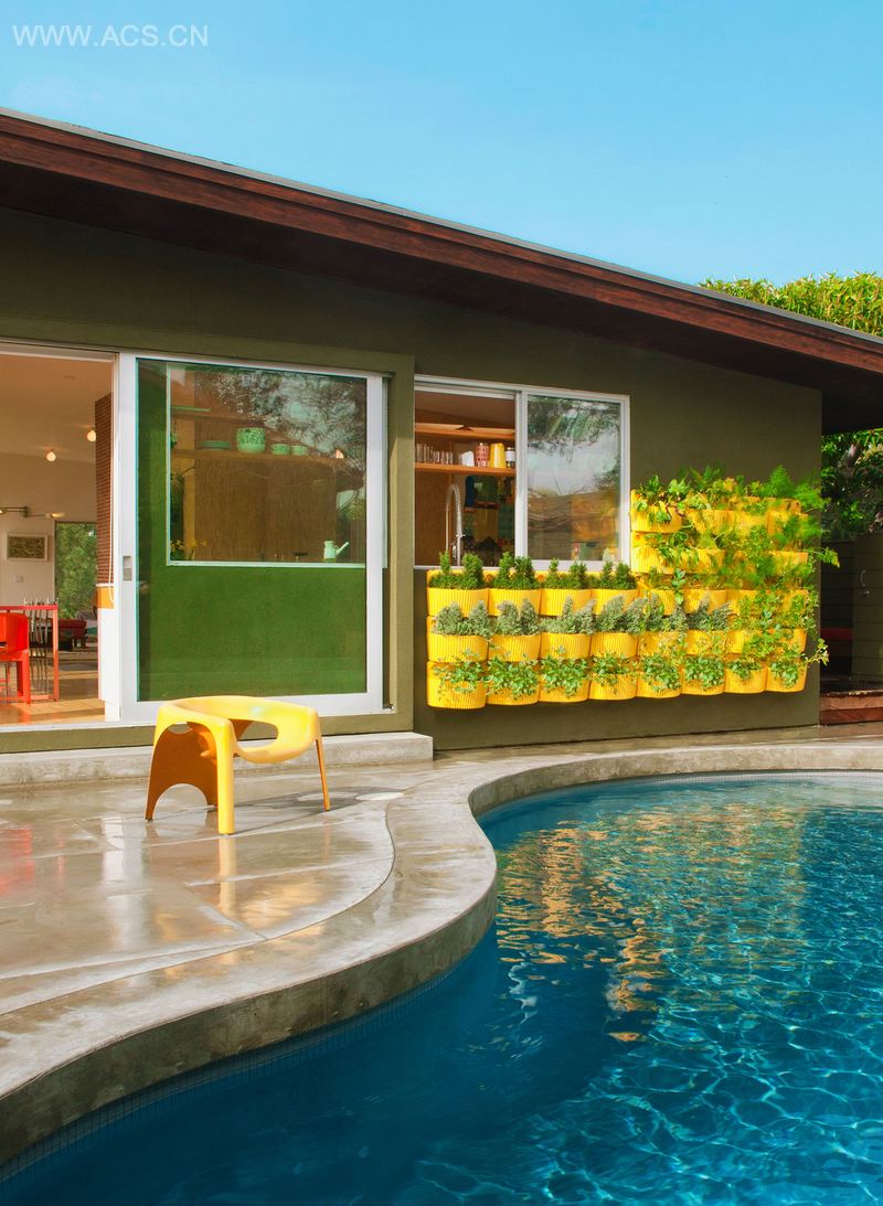 设计师在紧挨着芭芭拉·贝斯特住宅池子的地方建造了一座大型可用的户外花园。住宅的厨房的窗户是可滑动的,因此,只要微风吹来,住宅都会弥漫着一种迷迭香的气息。同时,在和家人一起做饭时,用户也能够轻易地从窗口摘取食料。芭芭拉·贝斯特喜欢把天然材料和鲜艳的色彩混合在一起,使得室内外的流动过渡非常自然,而在室内安置小型活体墙就变得轻而易举。即使室内空间不大,活体墙也是一个非常棒的绿化室内的方法。因此,行动起来,建造一个郁郁葱葱的花园吧!