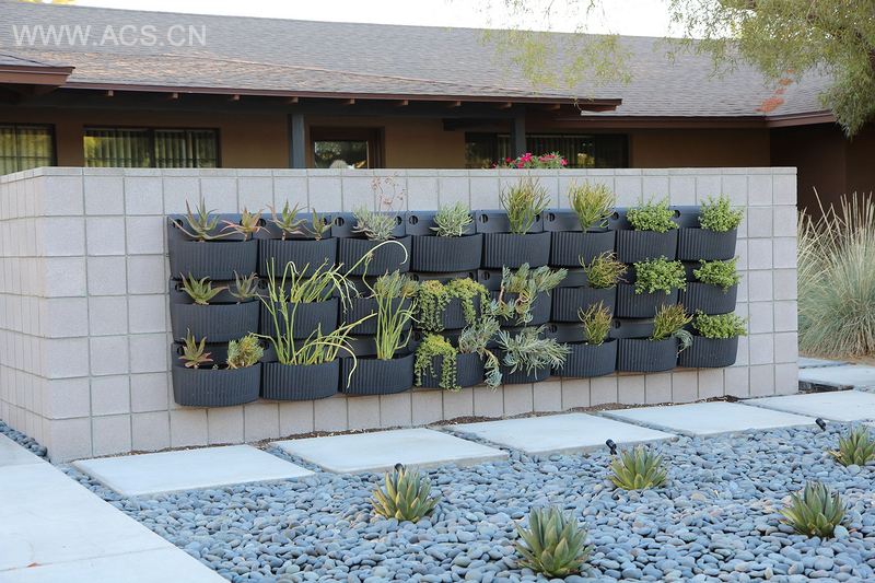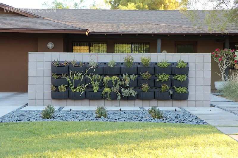 There were two design challenges with this Living Wall project. The first was concealing the drip irrigation lines and the second was plant selection. To meet the first challenge, a drip supply line kit was installed during the wall construction and situated between the blocks. The entry point is at the bottom of the back of the wall, and the exit point is in the middle of the wall on the front side, from where the supply line is connected to the Living Wall Planter Drip Kits; supply lines are designed to be concealed inside each watering tank. The final challenge, plant selection, was hindered by the fact that the wall faces south and is blasted by the hot, unforgiving Arizona sun. Although succulents are native to the Southwest, few can handle full exposure to the sun, especially when one of the requirements from the homeowner was no thorns. Please see the Plants tab for a full listing of the plants used in this project.