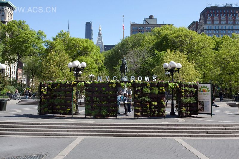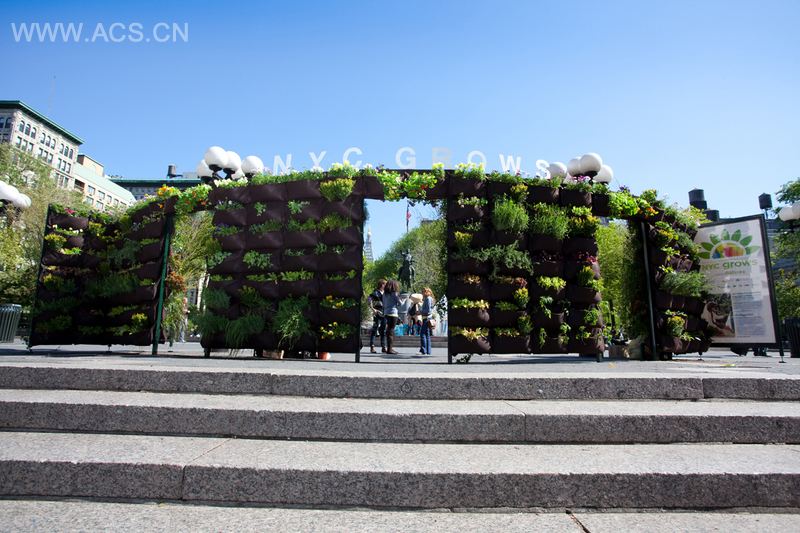The Woolly School Garden program officially launched on Earth Day (April 22, 2010) with a Woolly Pocket living wall garden in Union Square, New York City on April 25. A freestanding gateway composed out of living walls created a temporary outdoor destination for teachers and families to learn more about the Woolly School Garden program.