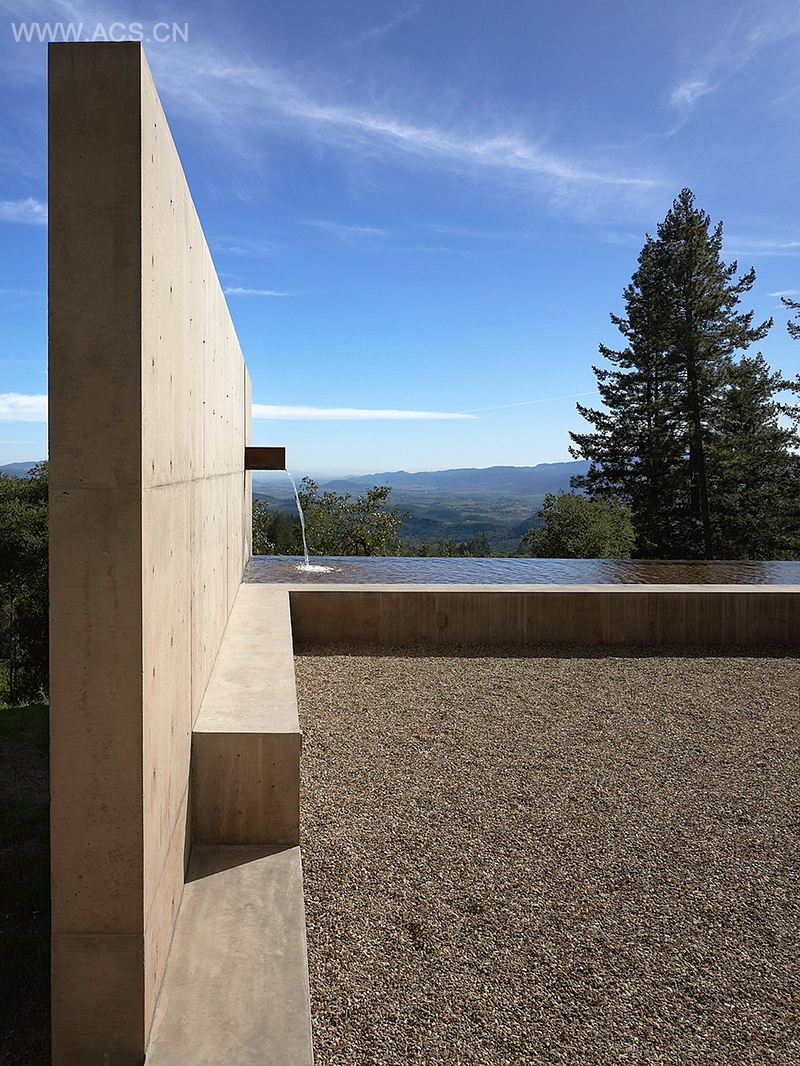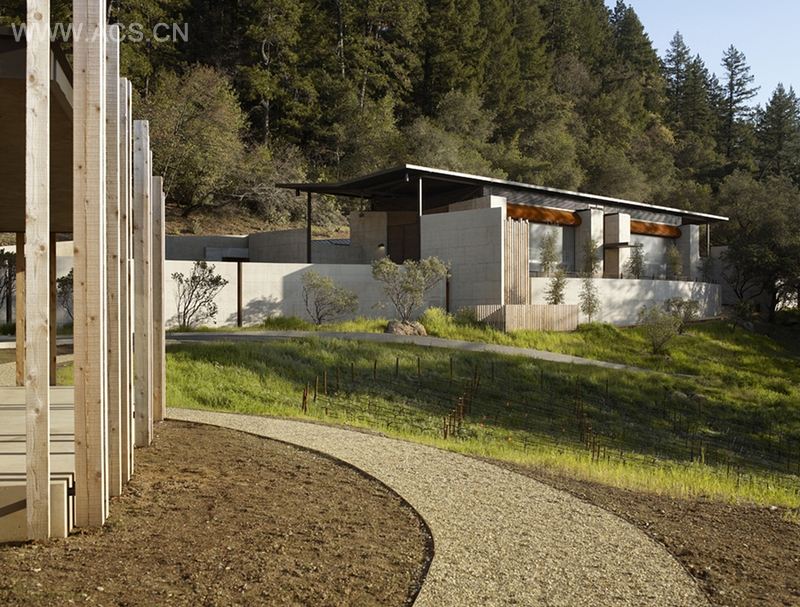设计灵感来自豪厄尔山的位置,急剧起伏的山丘,费尔南德兹将周围风景纳入设计中,挡土墙的流动和形状反映了山坡的轮廓,建筑的垂直部分和四周的高树相辅相成。储存仓建在山坡上,面积为1347 m2,灵感来自Plump Jack 的商标的倒置版。