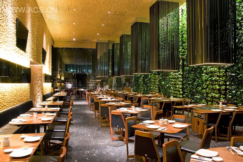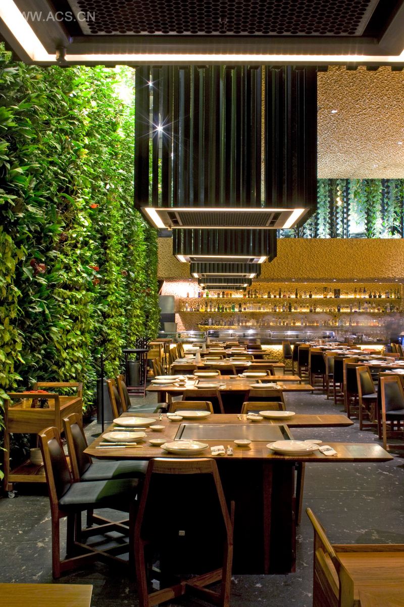 对客户来说重要的是把自然引入室内设计。设计师希望在餐厅里打造出种种能够唤起人们多种情感体验的不同环境。在景观设计师吉列尔莫·阿雷东多的帮助下,设计师打造了一面绿化模块墙,墙上悬挂着植物盆和滴灌系统。这个系统工程简单,对于室内来说较为简易。考虑到餐厅的选址以及墨西哥城的气候,这面植物墙选择了当地的植物以轻松应对当地环境,且能将维持的费用降到最低。植物墙上的植物纹理也使得其硬邦邦的墙壁看起来柔和了不少,在形成反差的同时,表达出别样的风格。