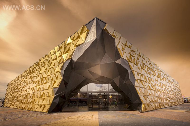 建筑物有一个35米长的外观,一瞥之下,参观者就能够了解他们在这里会发现什么:所有闪闪发光的都是金子!入口很显眼。“块金”建筑在此处打开门,提供通向“藏宝洞穴”的入口,真正的黄金宝藏安全地陈列在里面。