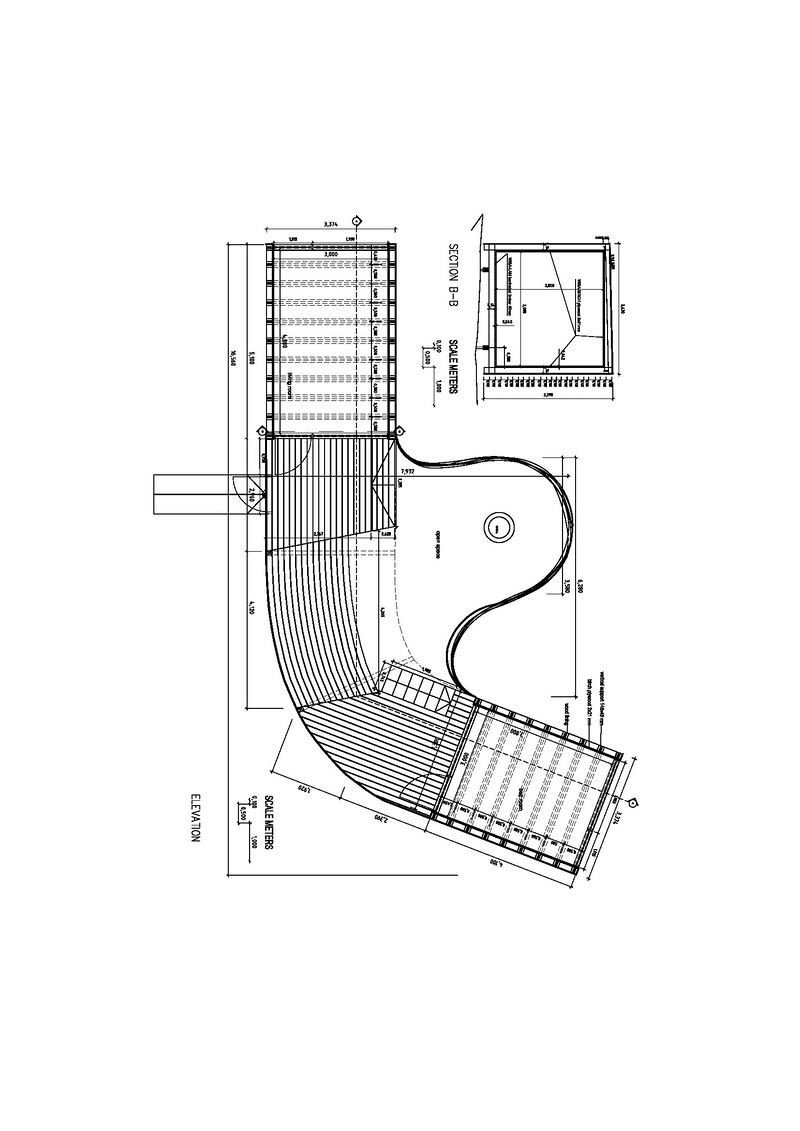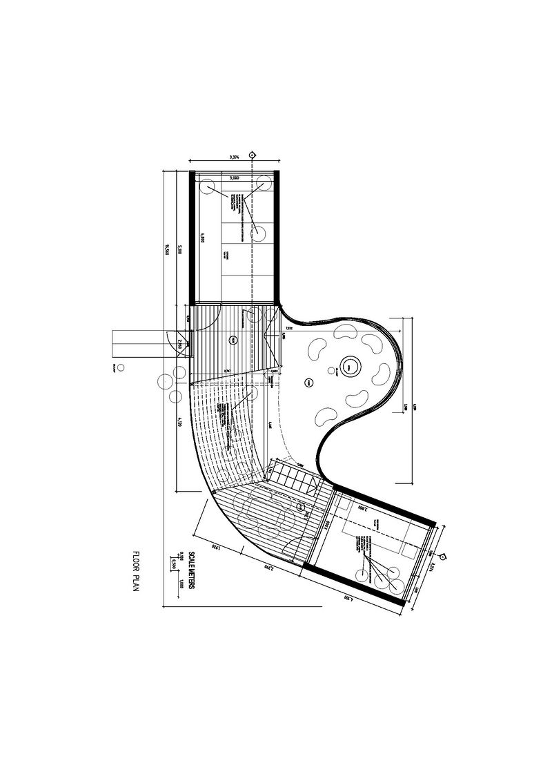 酒店处于一个被海水冲刷的小岛上的位置,给出了在暴风雨中浮动木块撞击岩石的设计理念。酒店有两个矩形的房间以及它们之间的自由外部空间。外部空间由房间和不同层之间夹角形成。理论上,通过使房间的壁变直并把它们砌至相同的水平线上,整个建筑可以建成矩形的。但其海上位置提供了试验弯曲木板的造船技术灵感。弯曲部分是由三块固定的8mm 的松木板组成,内外层是连续的,而中间层可以弯曲。室内装饰层是桦树板,结构是云杉,正面外观是高品质的无节松树板。外部用灰色保护漆处理,内部用涂彩处理。建筑与周围环境相互作用,有时远离它们有时融入到它们之中。这块覆盖着漂亮灰色铜绿的木板被分成板条状,呈现浅色、有机的木板结构,仿佛在岩石上可以看到的是一块被海水冲上来的木头。