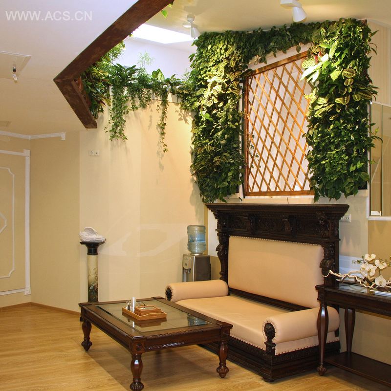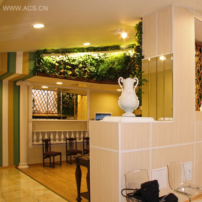 妇产科医院内的绿色起居室,因为有了墙体花园内独特的植物,而变得更加绿意盎然,充满生机。设计师必须解决屏风内方洞产生的视觉障碍,同时考虑空间内的结构特征。其中一个储水箱,被隐藏在白色圆柱内。
