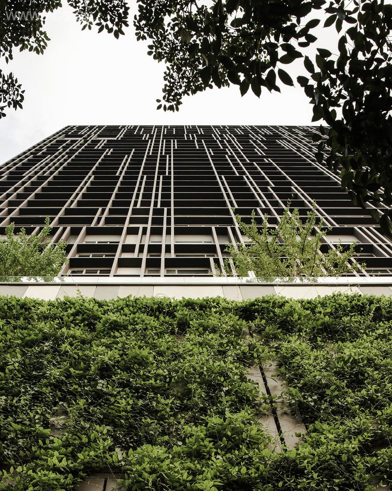 在视觉上,两座塔楼通过重叠的树木相连接,绿树环绕着32 层高的后楼(Ashton)和10 层高的复式前楼(Skyle)。建筑外层表皮由预制混凝土板、扩张金属网和种植器皿组成。这些组成成分的功能有所差别,分别起到覆盖遮阳设备和空气冷凝机组的作用。西侧和东侧是绿色的墙壁,面向热带阳光的方向。两面墙的高度分别是65米(前楼)和130 米(后楼),为住户提供了舒适的视觉环境和自然环境。