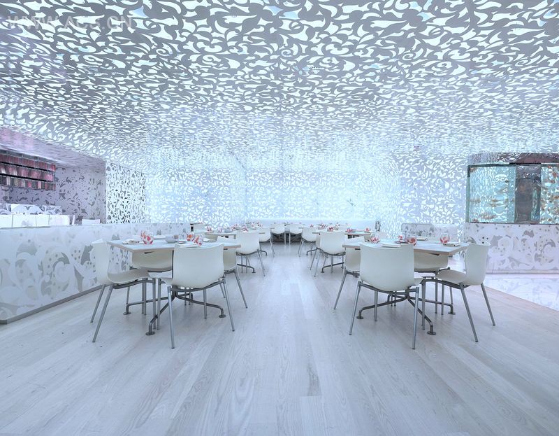 总的来说一个空间通常包括多样化室内因素、材料、系列的产品和适当布局的图案。这里没有支撑柱,餐厅利用这个优势在空间中仅仅使用一种图案,目的是在这个超现实的环境中心营造出简约的视觉上平静的氛围。
