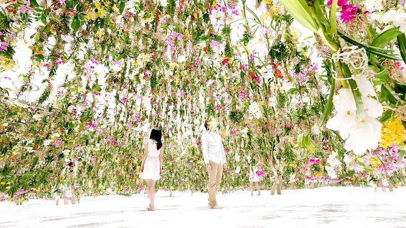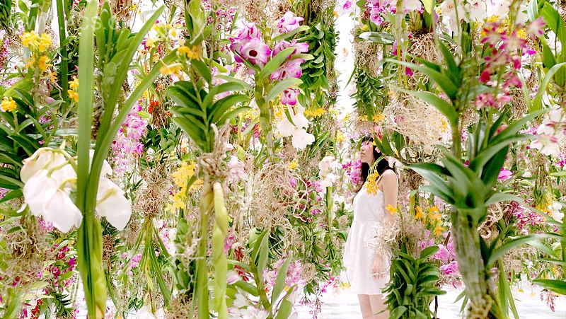 漂浮的花园,2300株可与人互动的鲜活花儿。漂浮的花园中遍布鲜花,随着空间中人们的动作上下漂浮。